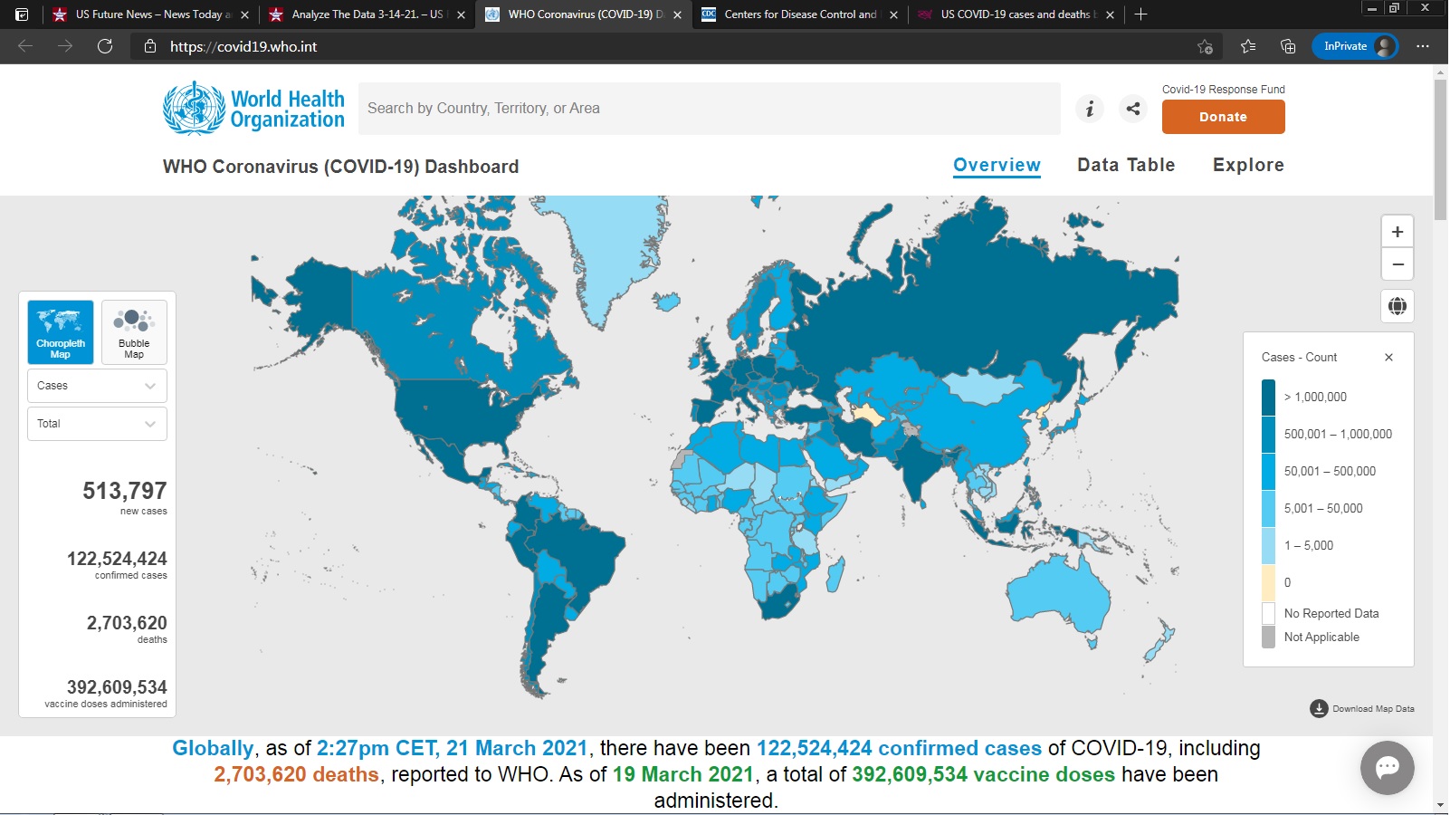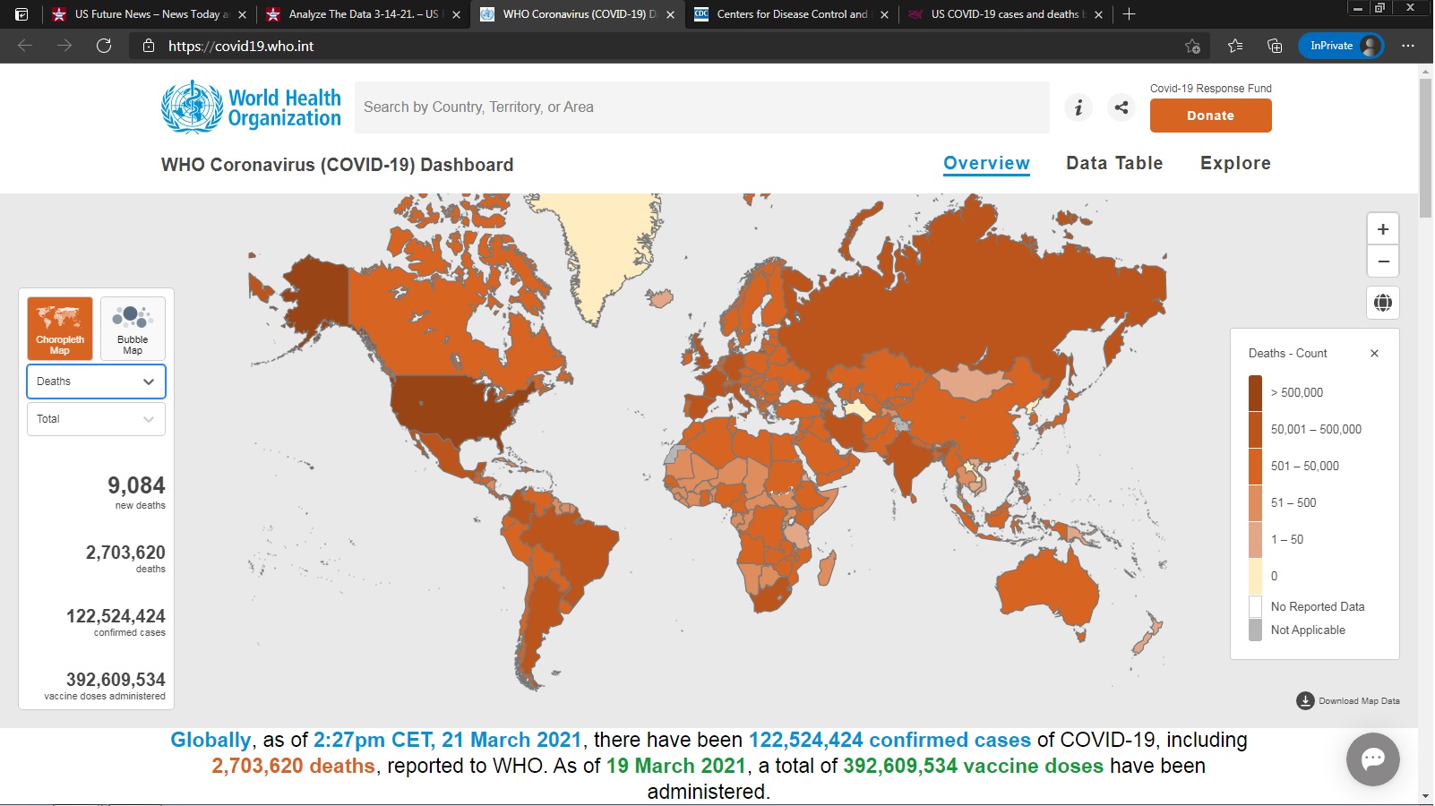 The United States of America, began vaccinations, and now we see a rise in cases and deaths. The United States has 24% of the World cases, and over 19.8% of the World deaths. This week the US has 11.3% of cases and 12.4% of deaths. The strangest result is, the Common Flu results, according to CDC, 28 positive cases this week, and 1822 cases this season. We should be seeing 20-28 million cases half way through the Flu season. Has this year’s Flu Vaccine, not created carriers, and therefore the US will not see herd immunity, therefore making the public more susceptible later on? Why does the United States have 19.8% of the deaths in the World, when we have 3 vaccines, 2 Antibody Cocktails, and the most advanced medical systems in the world, and less than 5% of the World’s population? The US Healthcare Professionals are either the greatest idiots in the world, or the provided information is faulty. Either the World’s numbers are made up, or the US numbers are, or both. We do not see the crash of countries, mass graves, death carts, the burning of homes, villages, and bodies, in poor countries. A pandemic of over a year, has 122 million cases and 2.7 million deaths. The Common Flu used to have 1 billion cases and 3-4 million deaths each year, but seems to have almost vanished this year. Has the World been battling the Common Flu, or is it nearly eradicated? No case data available this week. Normally the World sees up to 2.7 million cases per day.