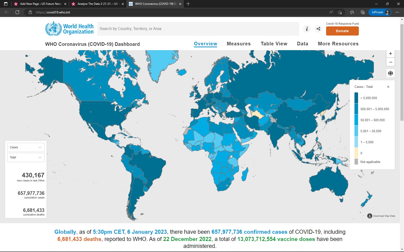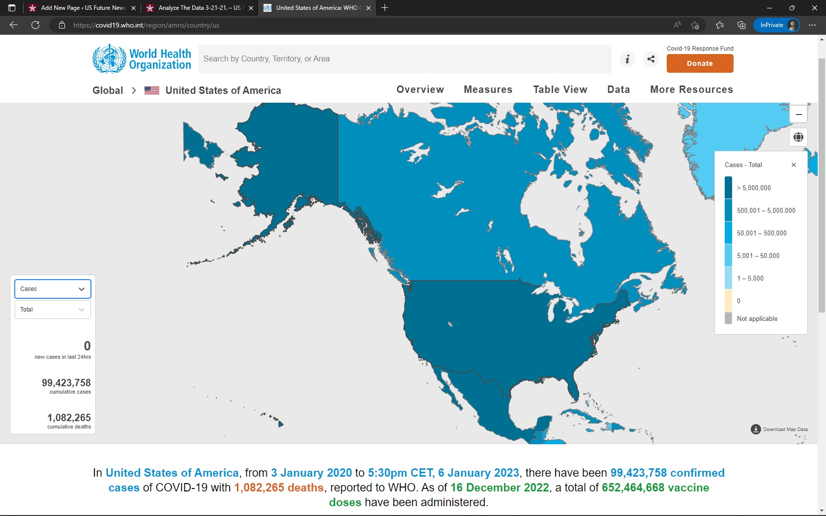 As of 1-8-23,The World has had 657,977,736 Covid-19 cases, and 6,681,433 Covid-19 deaths. The United States of America has had 99,423,758 Covid-19 cases, and 1,082,265 Covid-19 deaths. Since 3-21-21, The World has seen 535,453,312 Covid-19 cases, and 3,977,813 Covid-19 deaths. The United States of America has seen 69,985,988 Covid-19 cases, and 546,257 Covid-19 deaths. The Covid-19 numbers are far less than the pre-pandemic Common Flu numbers. The Common Flu numbers in the United States of America, are still very low. Week 52 in the US, saw 14,640 cases, and this season, since Week 40, saw 308,408 cases.