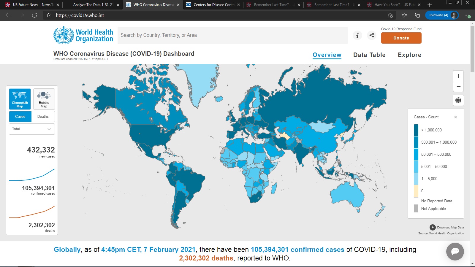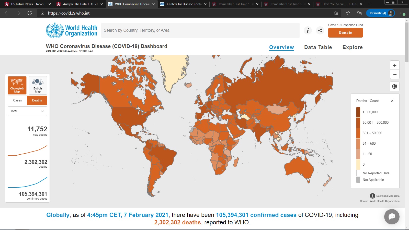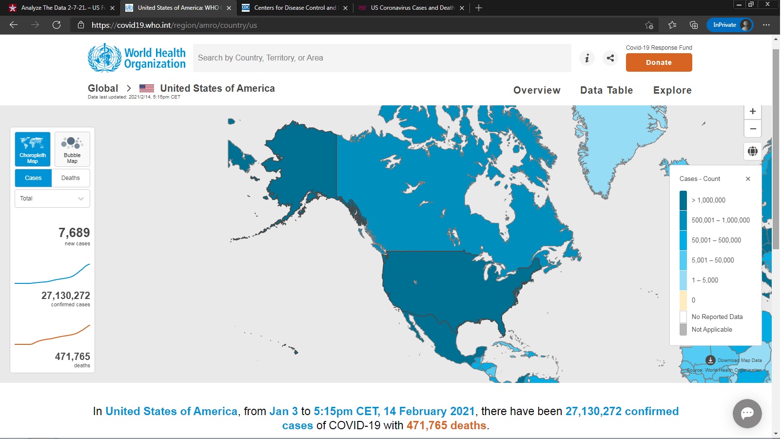 The United States of America, began vaccinations, and now we see a rise in cases and deaths. The United States has 25% of the World cases, and over 20% of the World deaths. This week the US has 14.9% of cases and 15.4% of deaths. The strangest result is, the Common Flu results, according to CDC, 22 positive cases this week, and 1764 cases this season. We should be seeing 20-28 million cases half way through the Flu season. Has this year’s Flu Vaccine, not created carriers, and therefore the US will not see herd immunity, therefore making the public more susceptible later on? Why does the United States have 20% of the deaths in the World, when we have 3 vaccines, 2 Antibody Cocktails, and the most advanced medical systems in the world, and less than 5% of the World’s population? The US Healthcare Professionals are either the greatest idiots in the world, or the provided information is faulty. Either the World’s numbers are made up, or the US numbers are, or both. We do not see the crash of countries, mass graves, death carts, the burning of homes, villages, and bodies, in poor countries. A pandemic of over a year, has 119 million cases and 2.6 million deaths. The Common Flu used to have 1 billion cases and 3-4 million cases each year, but seems to have almost vanished this year. Has the World been battling the Common Flu, or is it nearly eradicated? No case data available this week. Normally the World sees up to 2.7 million cases per day.